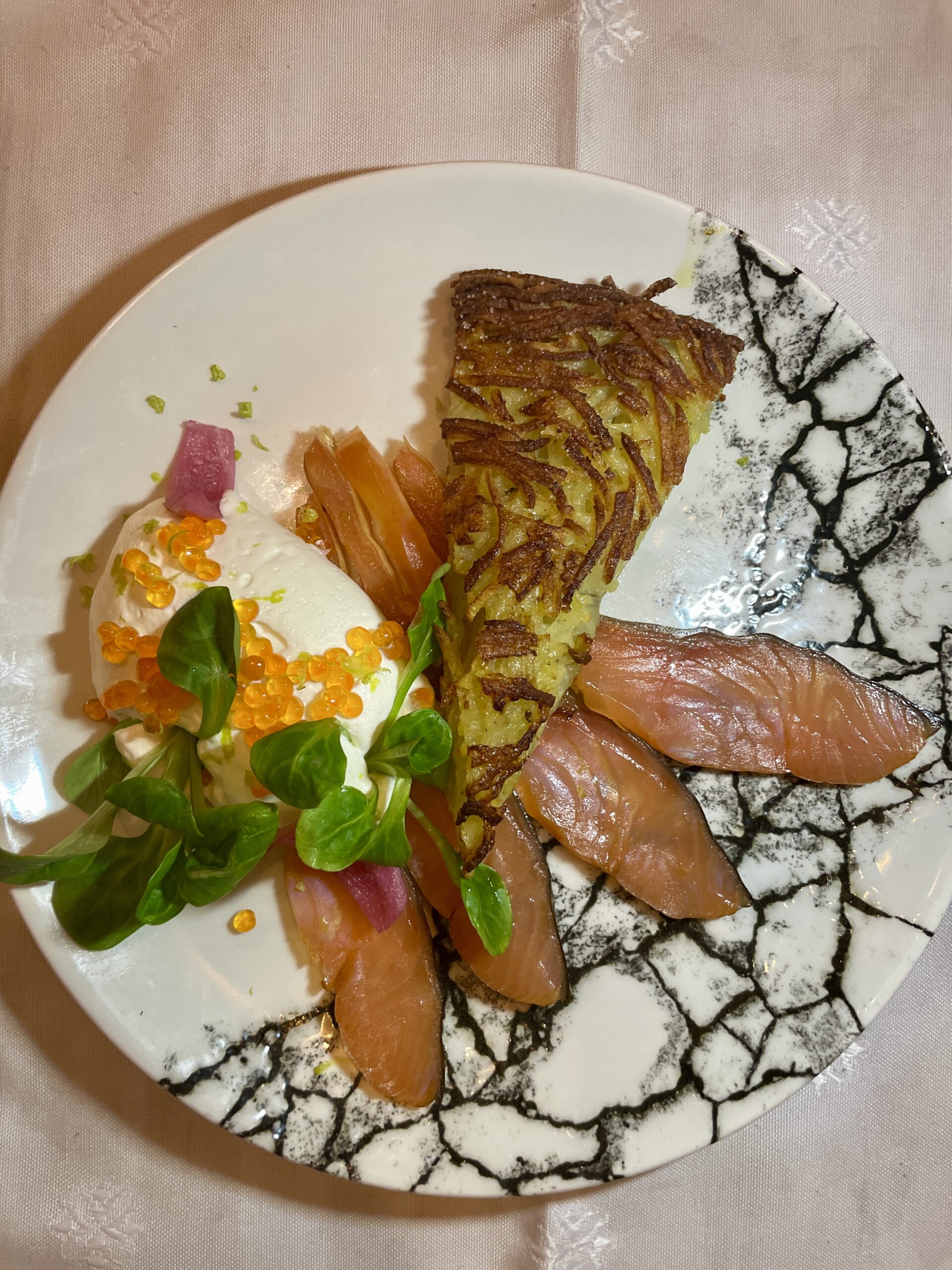 / Saumon fumé au bois de hêtre, pommes de terre rösti, crème montée aux oeufs de truite